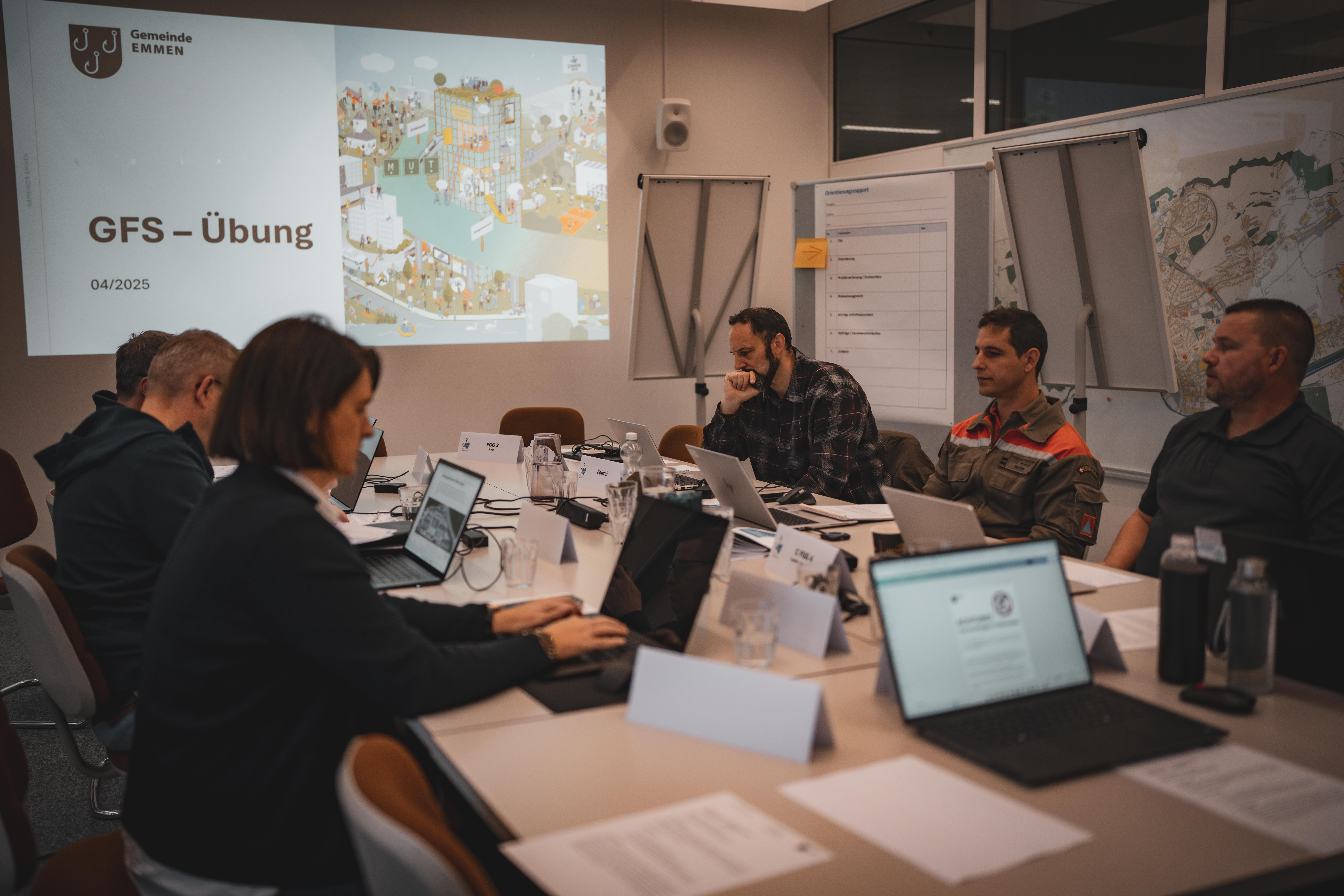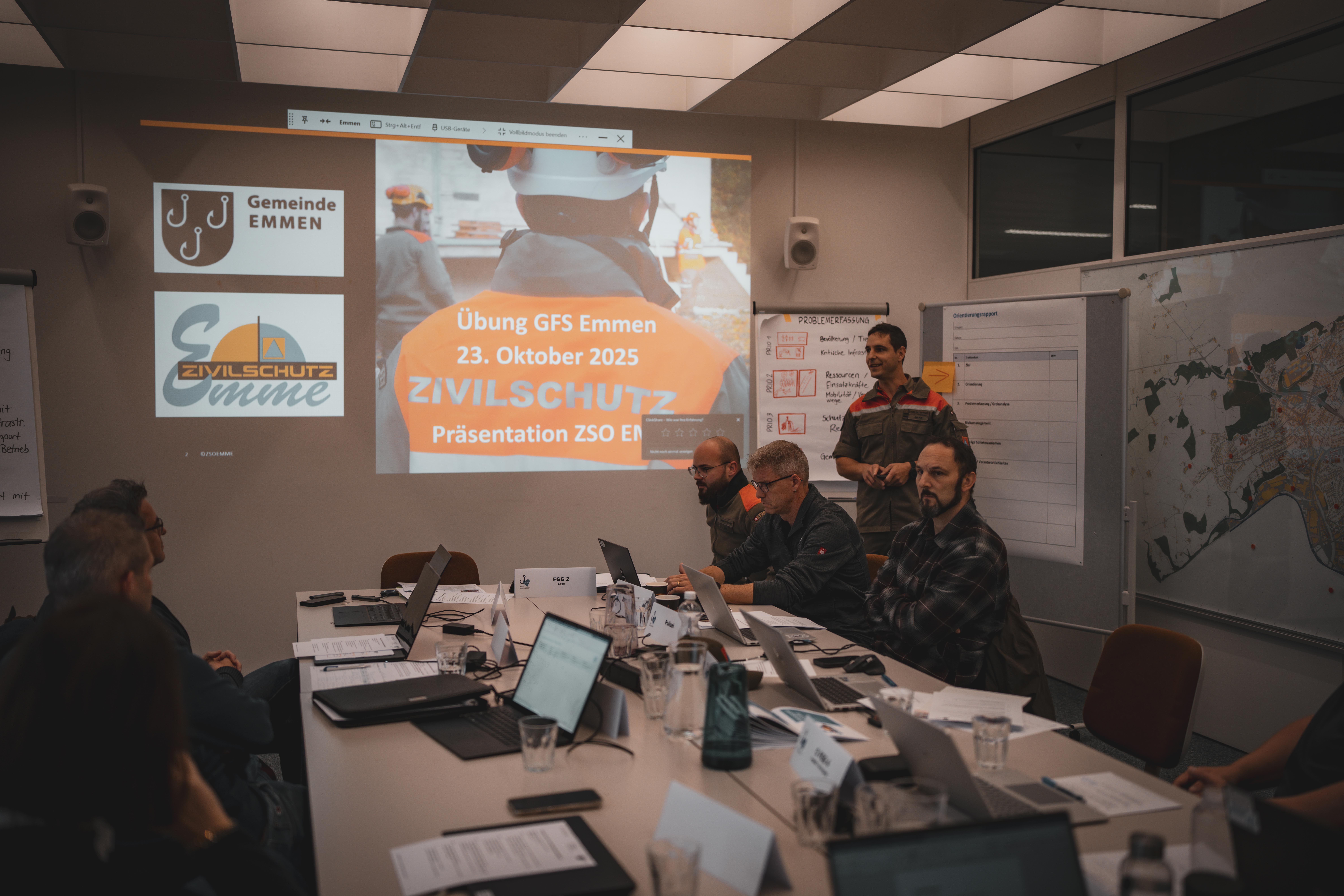 Ende Oktober 2025 führte der Gemeindeführungsstab (GFS) Emmen gemeinsam mit Polizei, Feuerwehr und Zivilschutz eine Stabsübung zur Krisenbewältigung durch. Im Fokus stand die Zusammenarbeit in einer Hochwasserlage – von der Koordination bis zur Kommunikation.