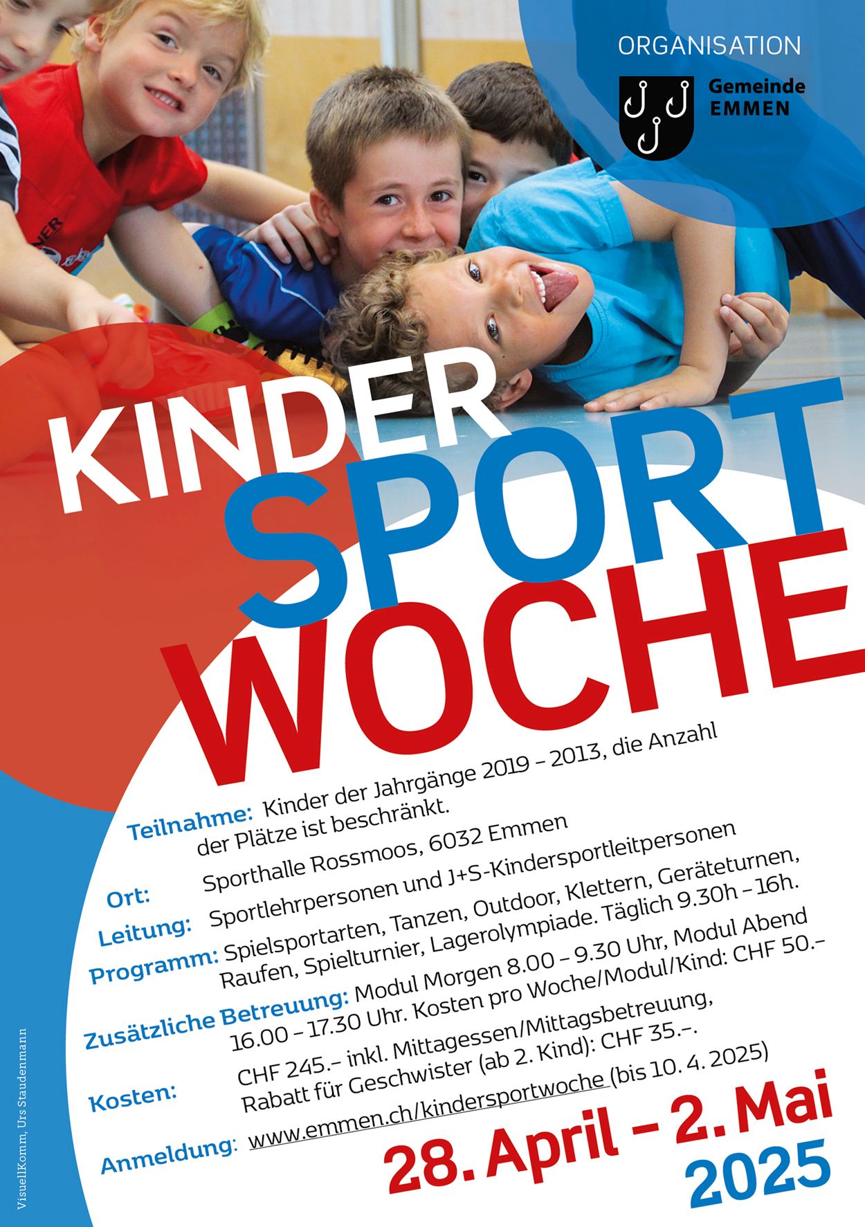 Vom 28. April bis 02. Mai 2025, in der zweiten Osterferienwoche, organisiert der Bereich Sport der Gemeinde Emmen in der Rossmooshalle eine polysportive Kindersportwoche. Diese ist für Kinder der Jahrgänge 2018 bis 2012 gedacht. In dieser Woche haben die Kinder die Möglichkeit, neue Freundschaften zu schliessen und verschiedene Sportarten kennenzulernen. Sie können ihren natürlichen Bewegungsdrang ausleben, eine Vielzahl an Bewegungserfahrungen sammeln, gesund essen und sich spielerisch mit anderen Kindern messen. Die Gruppen werden altersgerecht eingeteilt und bleiben über die gesamte Woche bestehen. Zur Mittagszeit erhalten die Kinder eine gesunde und ausgewogene Verpflegung, wobei sie von den Leiterpersonen beaufsichtigt werden.