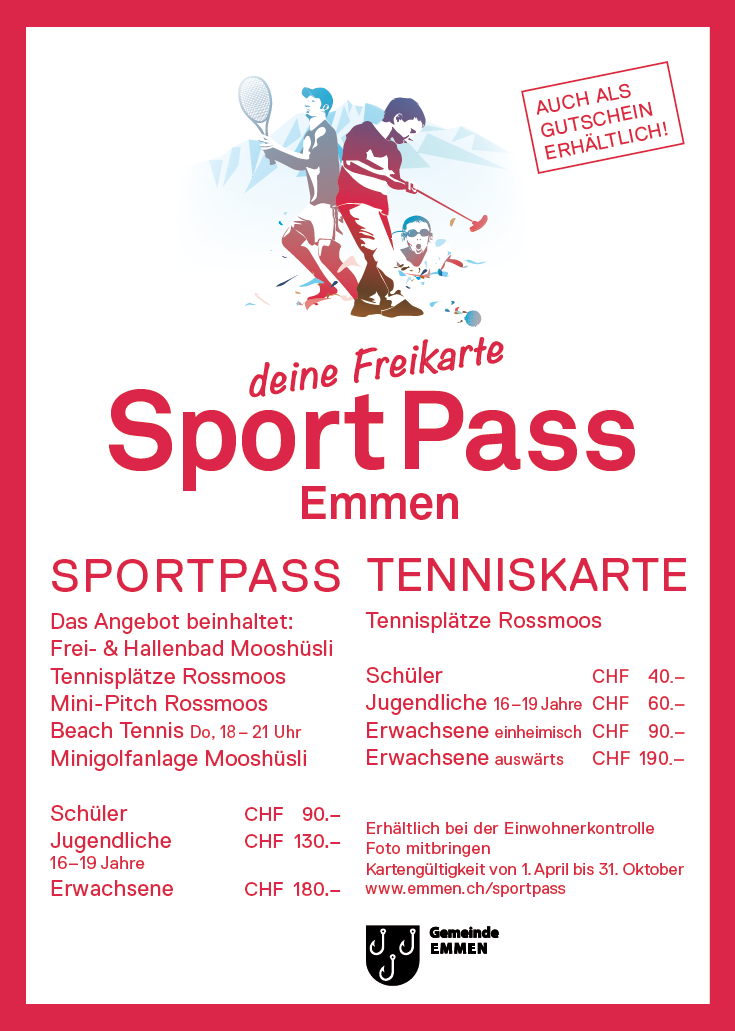 Profitieren Sie mit dem Sportpass vom 1. April bis 31. Oktober vom freien Eintritt in das Frei- und Hallenbad und die kostenlose Benützung von verschiedenen Sportanlagen und Angeboten. Holen Sie sich die Freikarte zu mehr Bewegung und Spass. Exklusiv für die Emmer Bevölkerung. Erhältlich bei der Einwohnerkontrolle der Gemeinde Emmen.